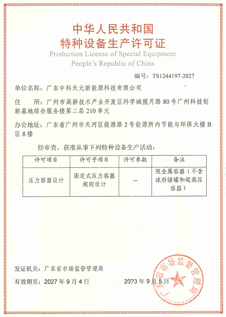中科天元壓力容器設(shè)計(jì)許可完成換證工作,新證已由廣東省市場監(jiān)督管理局于2023年9月5日核發(fā)。新證的許可項(xiàng)目為固定式壓力容器規(guī)則設(shè)計(jì)(限金屬容器,不含球形儲(chǔ)罐和超高壓容器)。